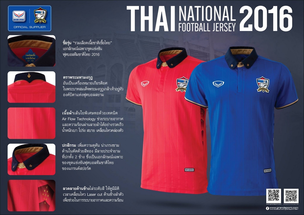 เปิดตัวผ่านสายตาแฟนๆ ฟุตบอลทีมชาติไทยเรียบร้อย เมื่อวันจันทร์ที่ 29 สิงหาคม 2559 ที่ผ่านมาทางสื่อออนไลน์ สำหรับชุดแข่งใหม่ของทีมชาติไทย เวอร์ชั่น 2016 ผลิตโดยแกรนด์สปอร์ตเช่นเคย โดยมีชื่อเรียกว่า “รวมเลือดเนื้อชาติเชื้อไทย” ซึ่งเป็น หนึ่งในท่อนคำร้องเพลงชาติไทย แสดงถึงการหลอมหลวมเป็นหนึ่งเดียวของคนไทย ได้ยินครั้งใดก็บังเกิดความฮึกเหิม พร้อมที่จะร่วมแรงร่วมใจสู้เพื่อประเทศชาติ